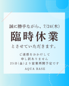 7月24日(木)誠に勝手ながら臨時休業とさせていただきます。 ご迷惑をおかけしますが宜しくお願いします。 25日(金)〜通常営業いたします。