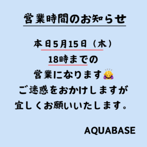 こんにちは!アクアベースです^^ まずはじめに6月21日(土)は水槽オーダーの打ち合わせの為17時までの短縮営業となります。 みなさまにはご迷惑をおかけいたしますが何卒よろしくお願いいたします。 そして先週まで開催してお […]
